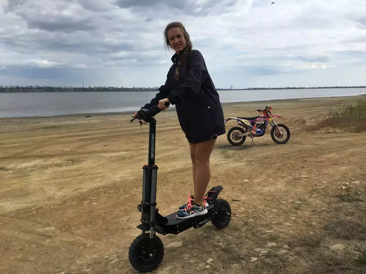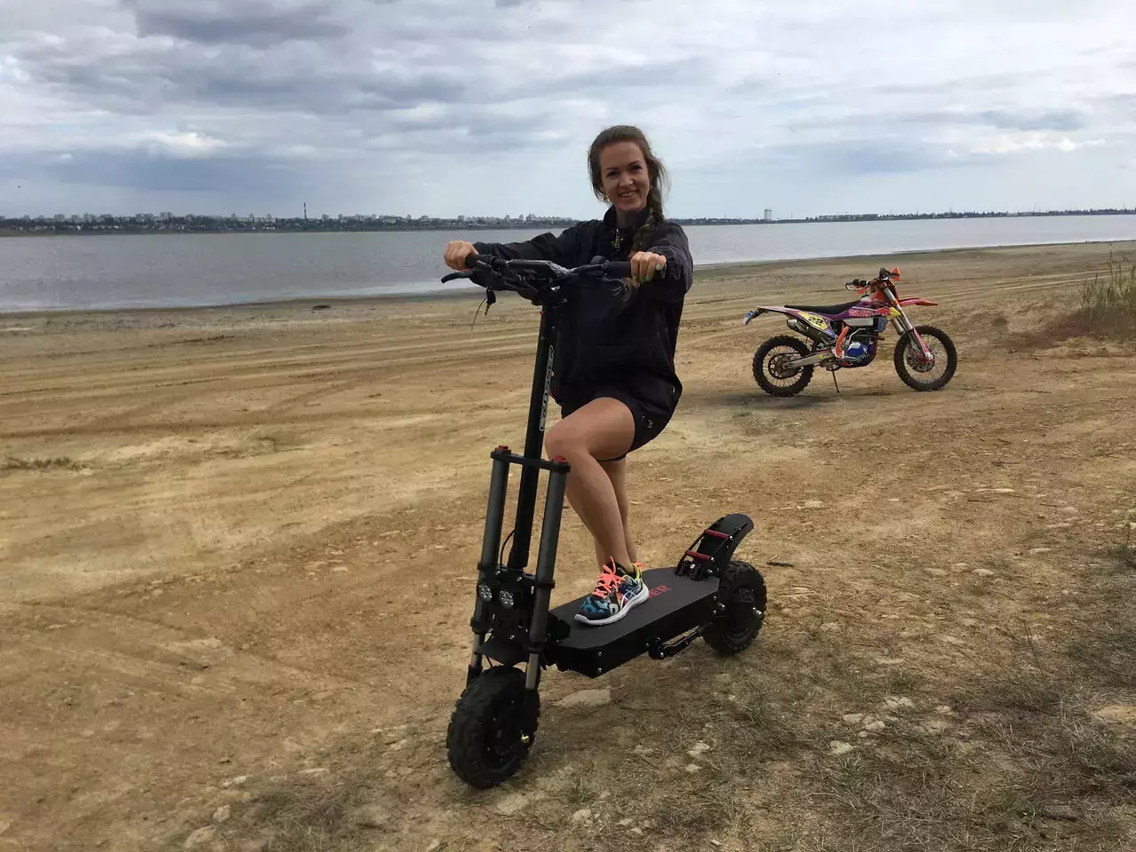 - Стильний і динамічний дизайн. Самокат повнопривідний, оснащений двома мотор-колесами потужністю 1600 Вт кожен. Пневматичні шини великого діаметра (11") і кліренс 22 см дозволяють легко долати різні перешкоди як в місті, так і за його межами.